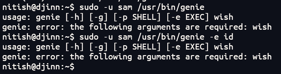 sudo -l查看的时候,发现可以以sam的身份无密码使用/usr/bin/genie