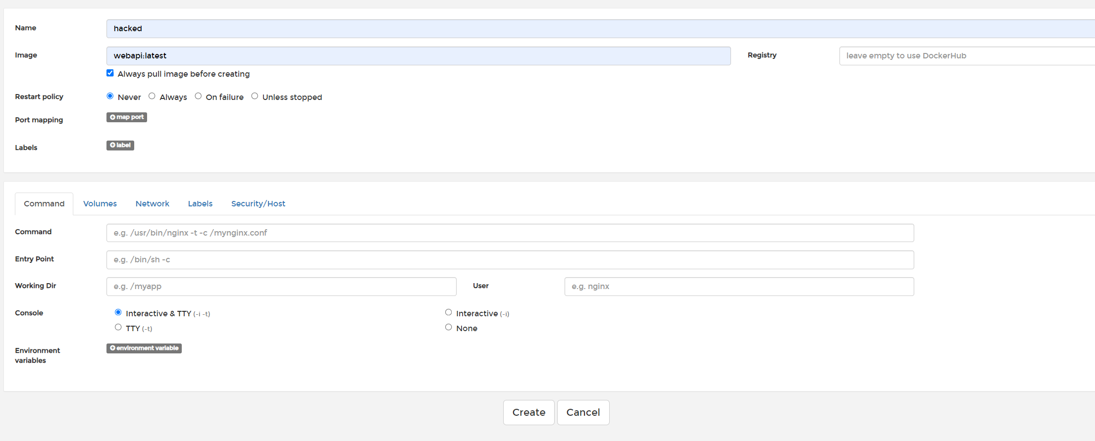 docker run -d -p 8080:8080 \ --net prodnet \ --ip 10.100.10.2 \ --name=tix-app \ -h tix-app \ -v /dev/null:/root/.ash_history:ro \ -v /dev/null:/root/.sh_history:ro \ -v /containers/database:/containers/database:ro \ -v /connect/.secret/:/.secret/:ro \ --restart=always \ tix-app