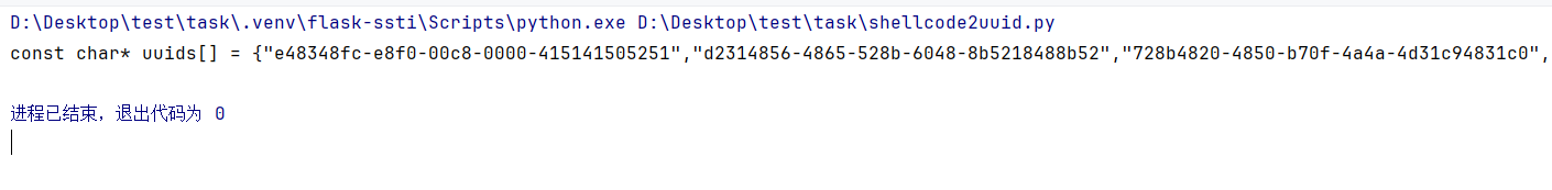 首先将包含shellcode的字节数组进行处理,确保为长度为16的倍数。然后再将shellcode划分成长16字节的块,并为每个块创建一个uuid,形成uuid列表,以c语言数组形式输出。